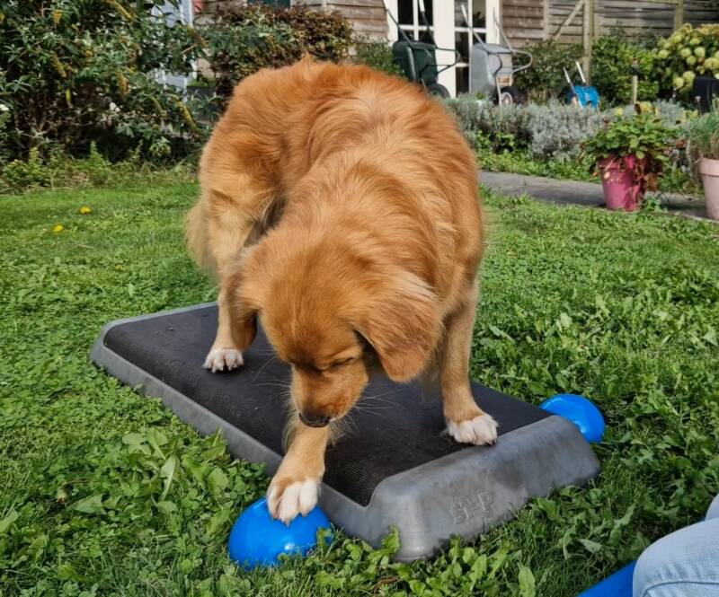 Met balans boelen we niet alleen dat de hond op een balanskussentje kan staan. Uiteraard trainen we wel een evenredige verdeling tussen voor/achter en links/rechts.